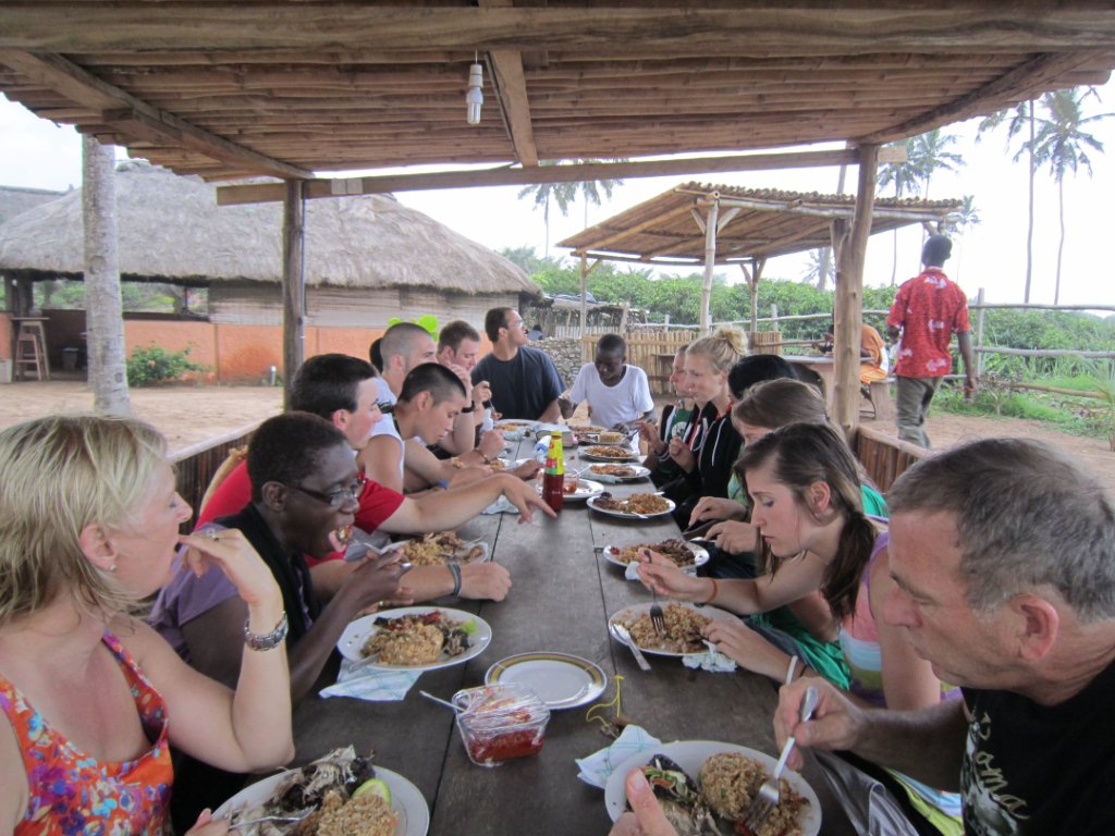 | All the team taking on the surf at Stumble Inn Cape Coast |